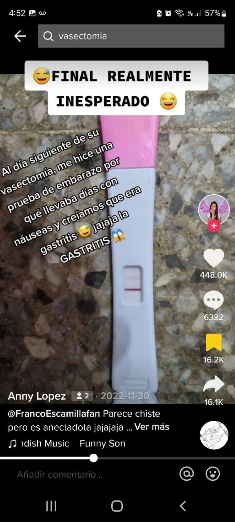 "Al día siguiente de su vasectomía, me hice una prueba de embarazo porque llevaba días con náuseas y creíamos que era gastritis", contó.