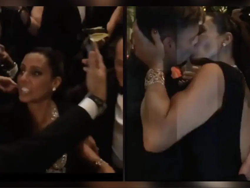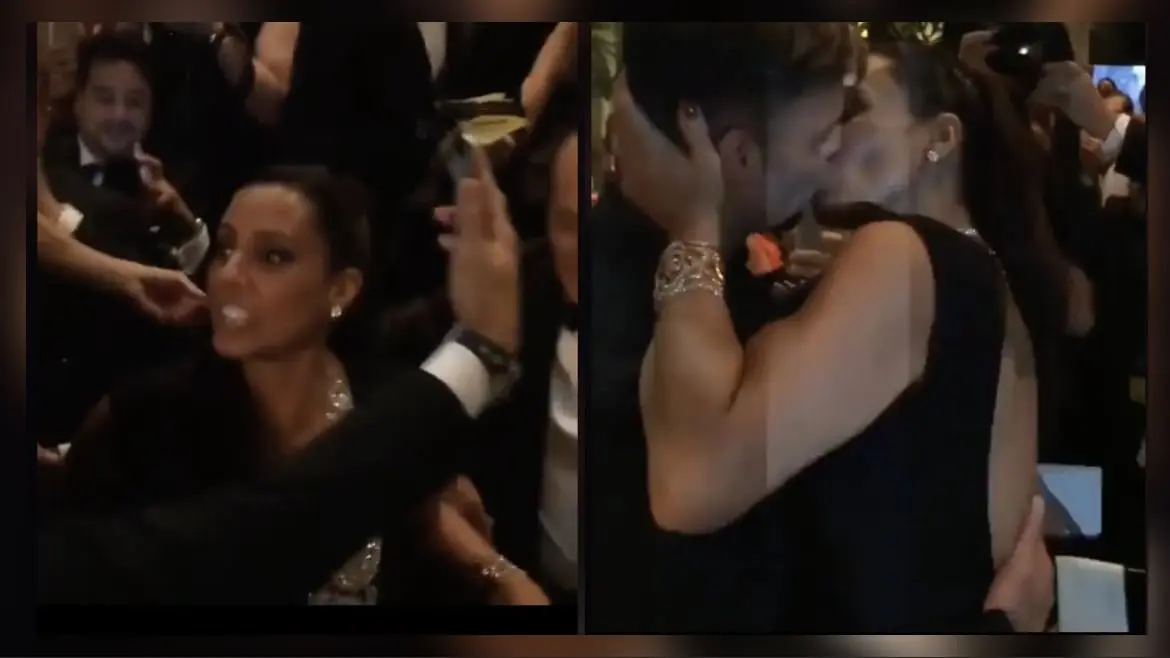 En un acto que sorprendió a los asistentes, Ana Paola Diniz se coloca frente a Ricky Martin, quien abre sus brazos en señal de bienvenida. La empresaria, sonriente, coloca su mano en la parte posterior de la cabeza del famoso, toma el control y protagoniza un beso profundo y apasionado, correspondido por el boricua.