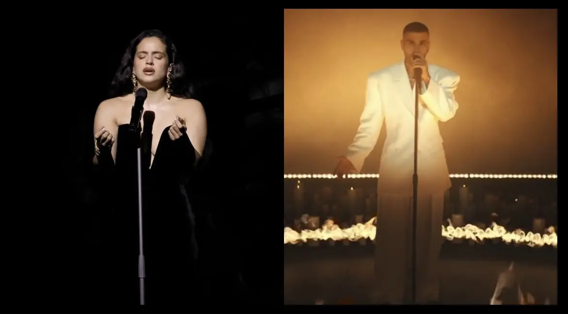 La cantante catalana, enfundada en un elegante vestido negro strapless que resaltaba su figura, cautivó al público con su inconfundible voz. Acompañada por un grupo flamenco compuesto por guitarristas y palmeras, Rosalía ofreció una actuación llena de nostalgia y dolor, capturando la esencia melancólica de la canción.