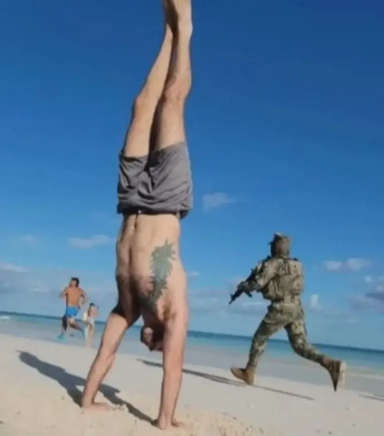 A través de redes sociales se ha vuelto viral un video que muestra el momento en que un profesor de yoga transmitía en vivo una rutina de ejercicios en una playa de Tulum, Quintana Roo, cuando accidentalmente grabó la persecución de dos marinos a un civil.