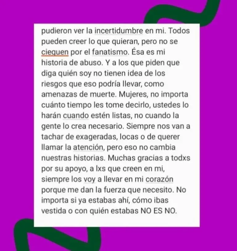 La foto del cantante se volvió viral en redes sociales, no sólo por aparecer en la marcha, sino también porque compartieron la denuncia de la víctima. De acuerdo con el testimonio que compartió la mujer, cuya identidad permanece en anonimato, los hechos habrían ocurrido en 2018.
