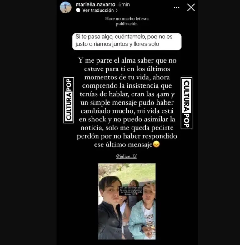 Además, junto al mensaje de despedida la amiga de Julián Figueroa señaló que hace poco había leído esta frase: "Si te pasa algo, cuéntamelo porque no se justo que riamos juntos y llores solo", lo que desató especulaciones sobre la causa de muerte del hijo de Maribel Guardia.