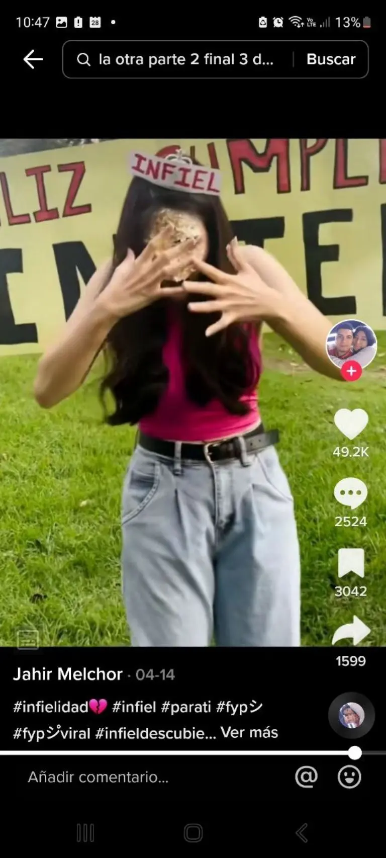 Finalmente, ambos jóvenes llevan a la novia a un parque en donde extendieron un enorme manta que decía: "Feliz cumpleaños infiel", además de que también le dieron un pastel con la misma frase para que no olvidara que había sido descubierta en la movida.