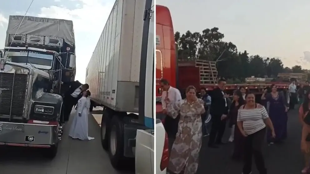 Al ritmo de "Payaso de rodeo", seres queridos de la pareja, automovilistas que quedaron varados por el bloqueo y hasta una vendedora de dulces convirtieron el asfalto en una pista de baile, donde se pusieron a bromear y celebrar con los novios.