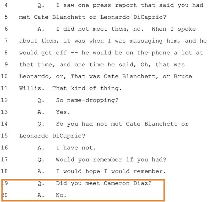 Johanna Sjoberg, una de las presuntas víctimas de Epstein, declaró que el magnate hablaba mucho por teléfono cuando ella le estaba dando masajes y le gustaba alardear que conocía a famosos. A menudo cuando colgaba las llamadas le decía: "Oh, ese era Leonardo Di Caprio, o esa era Cate Blanchett o Bruce Willis", pero nunca los conoció personalmente.
