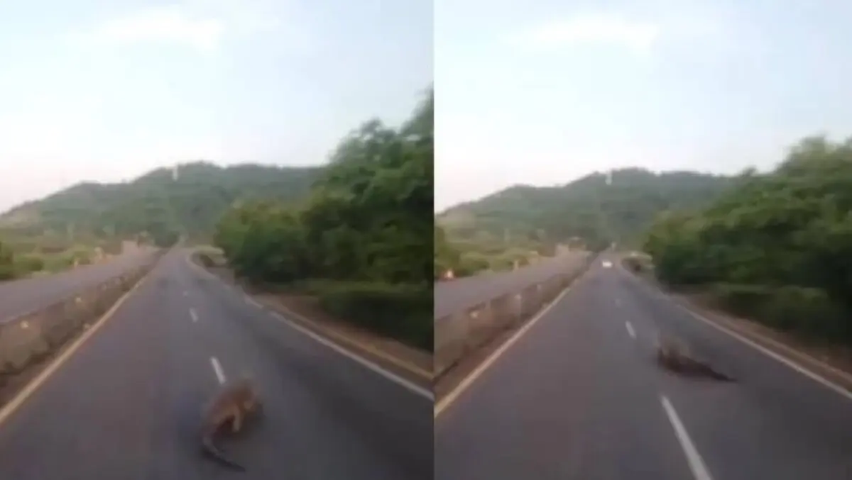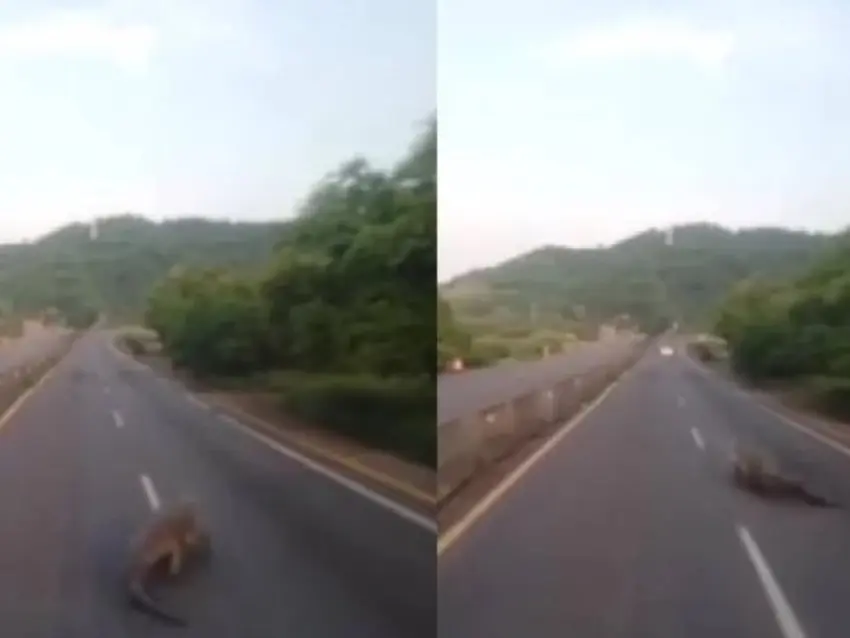 Un automovilista por poco y atropella a un enorme cocodrilo mientras circulaba por la autopista Manzanillo-Colima.