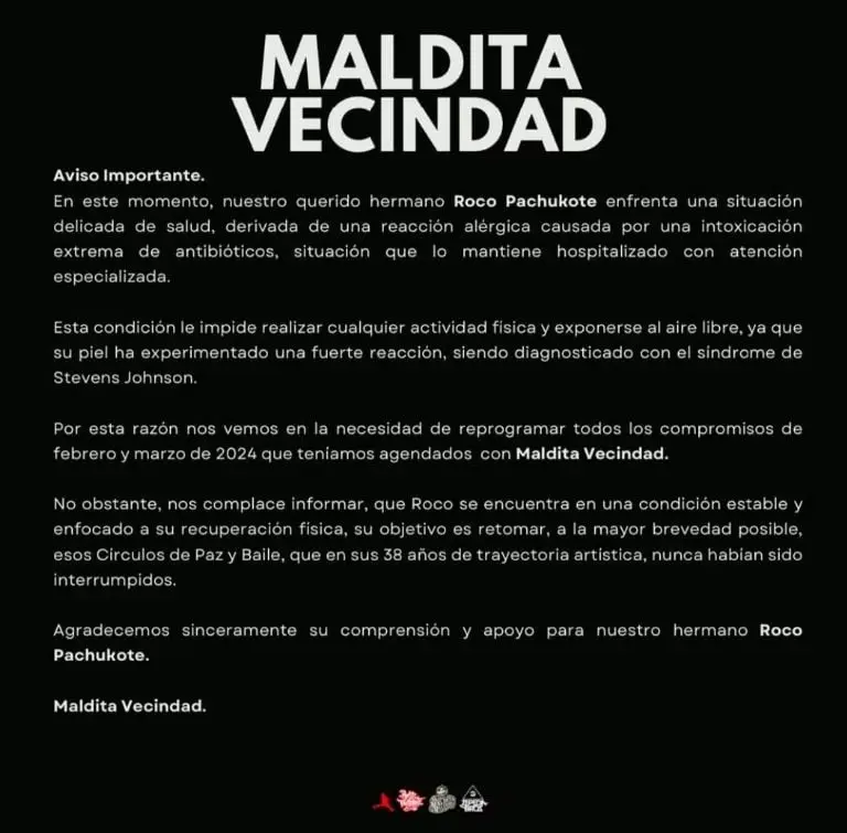 Lo anterior tendrá como consecuencia que algunos eventos programados del grupo tendrán que ser pospuestos o incluso cancelados: "Por esta razón nos vemos en la necesidad de reprogramar todos los compromisos de febrero y marzo de 2024 que teníamos agendados con Maldita Vecindad".