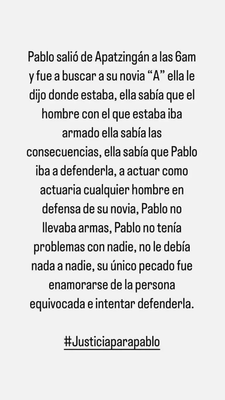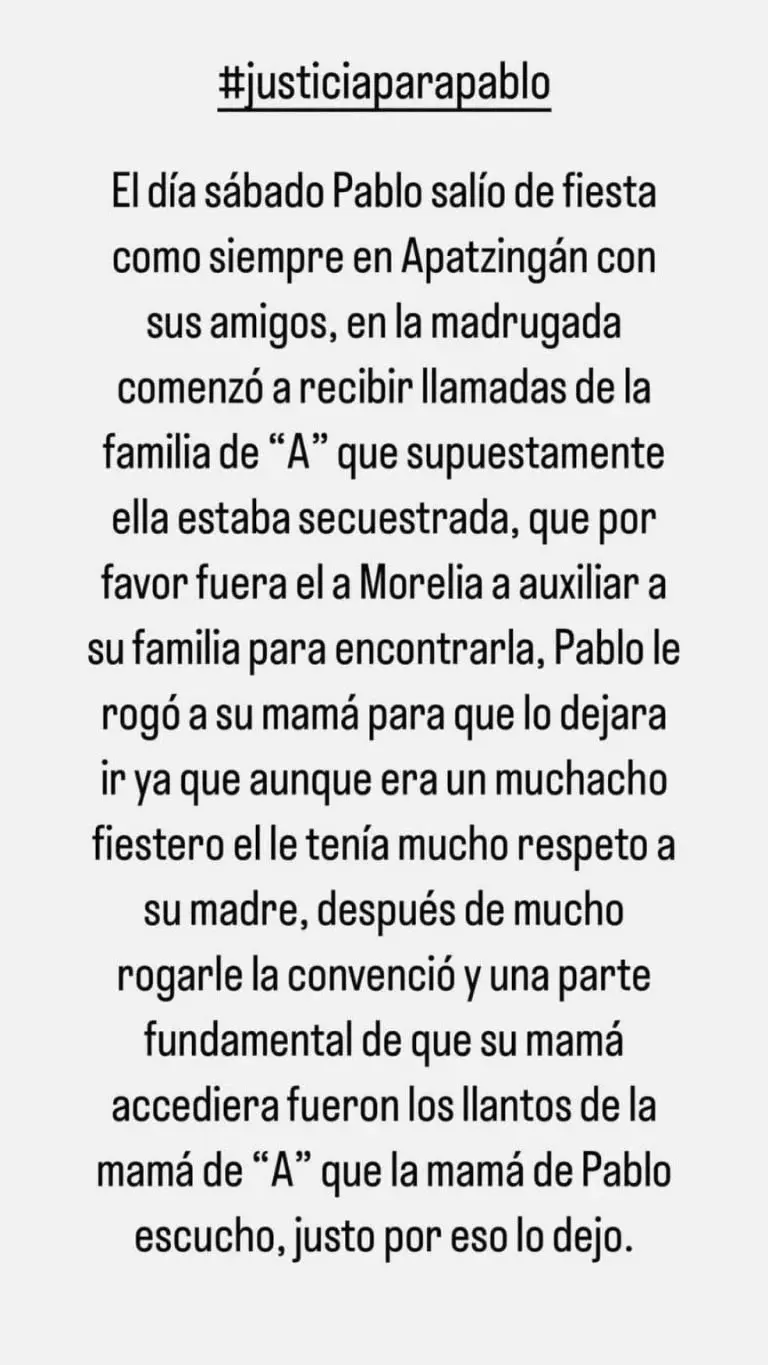 De acuerdo con el comunicado difundido, Pablo partió de Apatzingán hacia Morelia a las 6 de la mañana, con información proporcionada por Angélica A. sobre su último paradero, esto con la intención de ayudarla. Esta fue la información que la madre de Pablo brindó a los medios de comunicación. Ahora, el hashtag #Justiciaparapablo puede verse en varios medios de comunicación y en redes sociales.