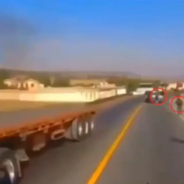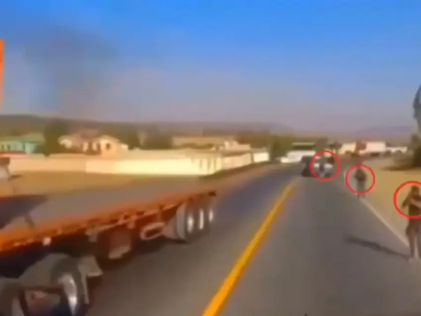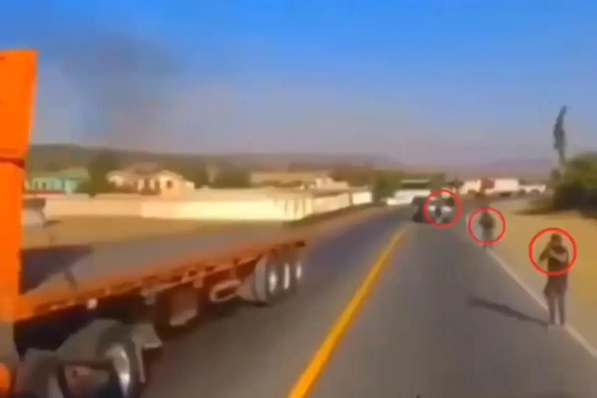 En el video difundido en redes sociales, se observa cómo una camioneta tipo pickup bloquea el paso del tráiler. Cuatro sujetos con armas largas descienden rápidamente del vehículo y encaran al conductor. En ese momento, aunque inicialmente se detiene, el operador pisa el acelerador y lanza el tráiler hacia ellos, obligándolos a dispersarse.