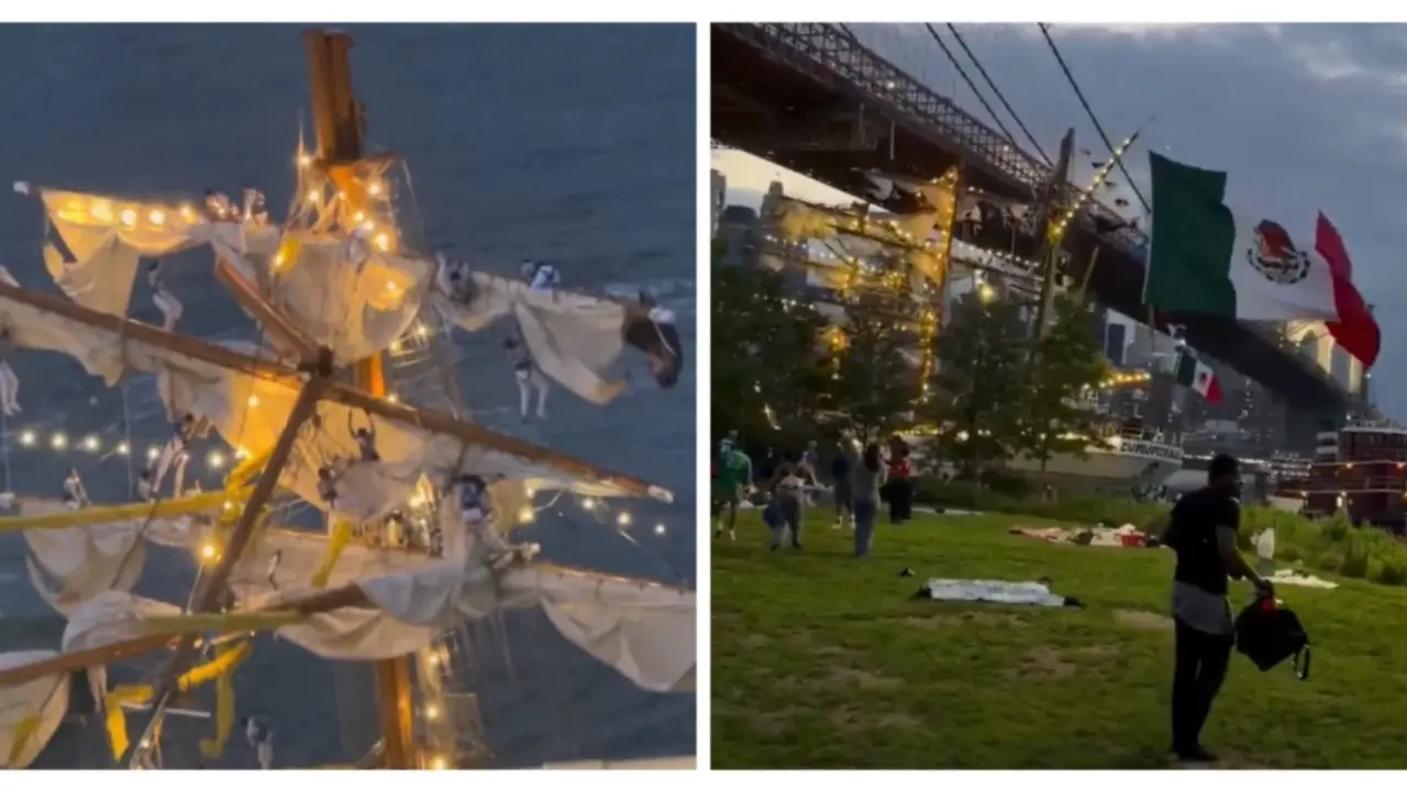 El velero de la Marina Armada de México sufrió un accidente en plena maniobra en el puerto de Nueva York; imágenes del impacto muestran el colapso de sus mástiles.