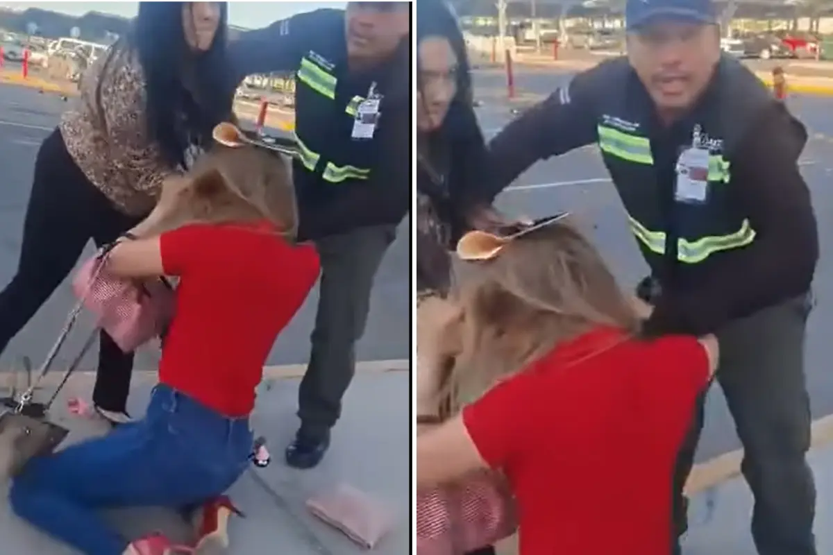 En las imágenes se ve a la agresora sujetar del cabello a la víctima, una mujer que vestía una camiseta roja y terminó arrodillada, con el rostro ensangrentado. El guardia de seguridad de un centro comercial intervino para intentar separarlas, sin embargo, la mujer continuó jalando con fuerza a su oponente, mientras el hombre que graba implora que la suelte.