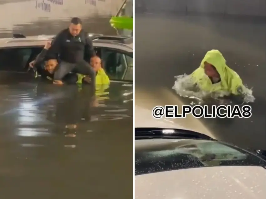 Un policía de la Ciudad de México fue captado mientras se sumergía en aguas negras para poder rescatar a un conductor.
