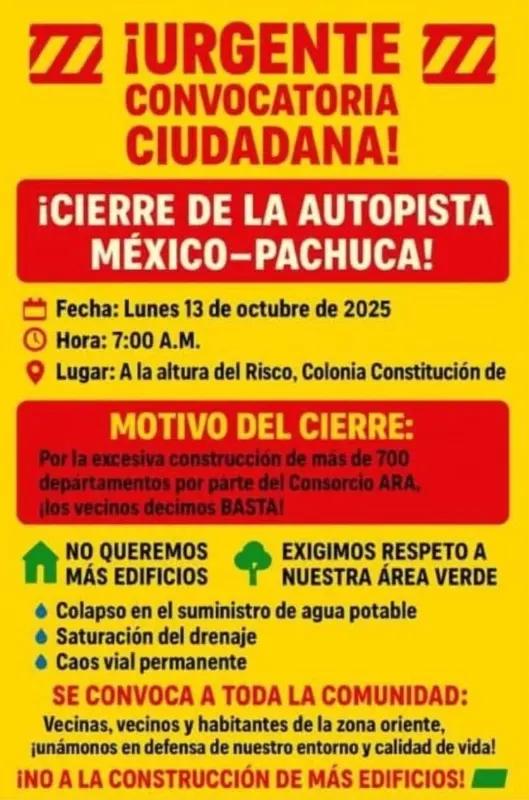 La primera manifestación está programada para iniciar a las 7:00 de la mañana, en la autopista México–Pachuca, a la altura del Risco, colonia Constitución. Vecinos de la zona exigen la suspensión de una obra de Consorcio ARA, que contempla más de 700 departamentos, por considerar que afectará la infraestructura y calidad de vida en la zona.