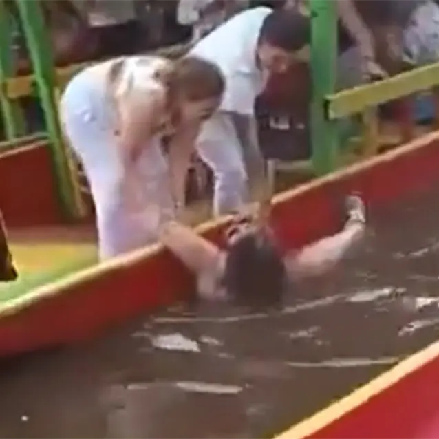 Dos hombres y una mujer terminan jalándola de las manos para subirla nuevamente a bordo, donde queda tendida en el piso, visiblemente alterada por el susto.
