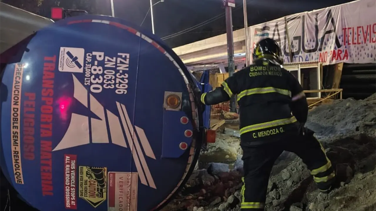 De acuerdo con los primeros reportes, el contenedor de la pipa se desprendió del tractocamión mientras la unidad se encontraba estacionada, lo que provocó que volcara en el cruce de Calzada de Tlalpan y Circuito Estadio Azteca.