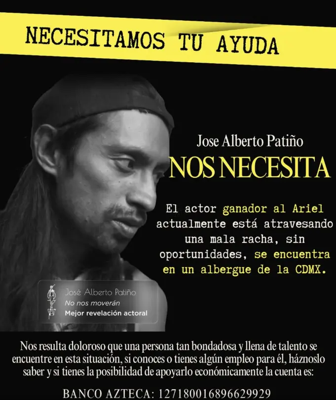 Hace apenas un año, José Alberto Patiño vivía uno de los momentos más importantes de su carrera. Su actuación en la película No nos moverán lo llevó a ganar el Premio Ariel como Revelación Actoral, colocándolo como una de las nuevas caras del cine mexicano. Hoy, su realidad es muy distinta.