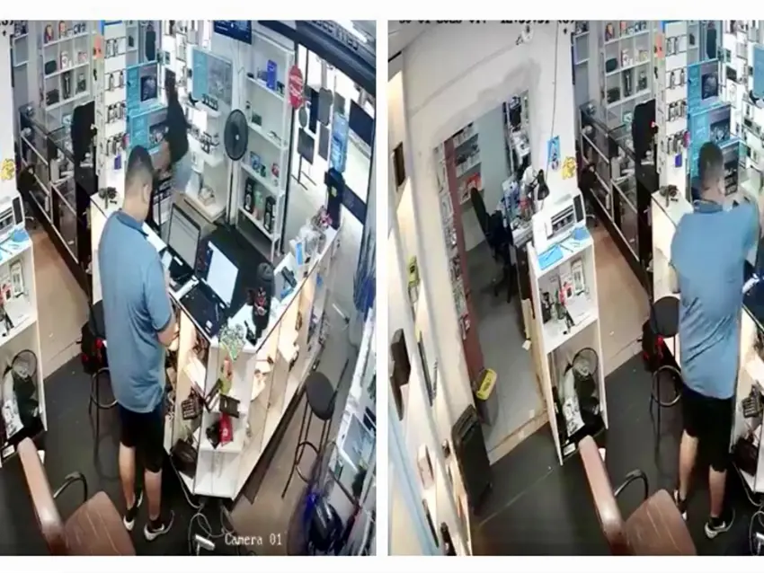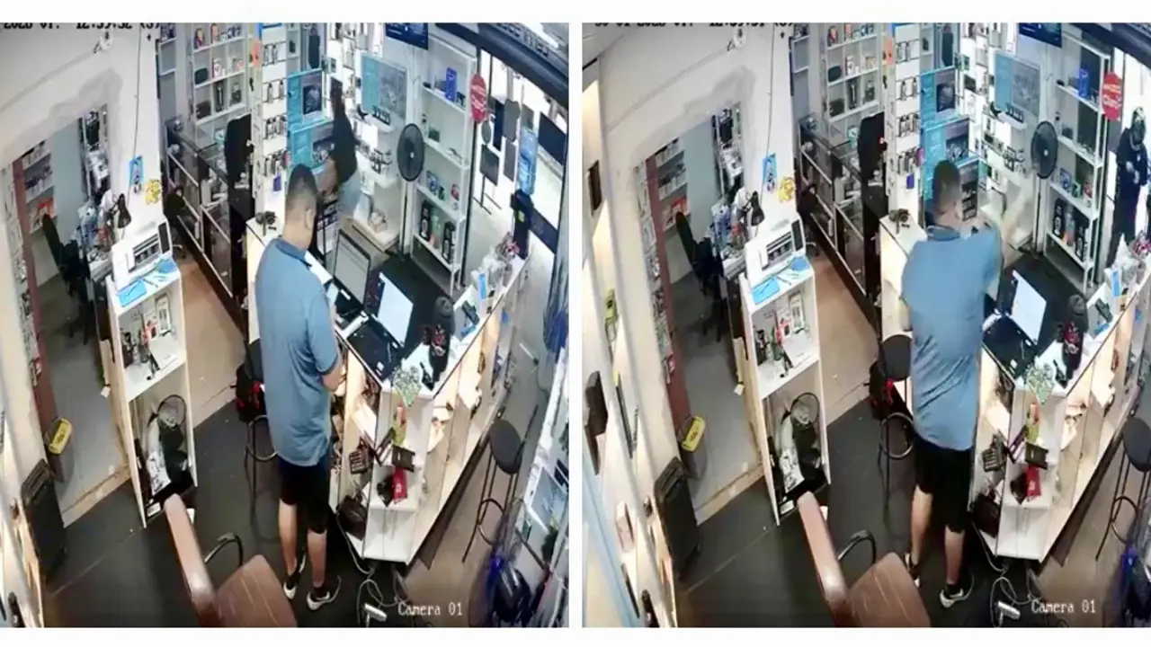 El hecho se registró en un negocio dedicado a la venta y reparación de teléfonos celulares. Según el relato del comerciante, dos hombres a bordo de una motocicleta se estacionaron frente al establecimiento. Uno descendió e ingresó sin quitarse el casco, mientras el otro permanecía afuera.
