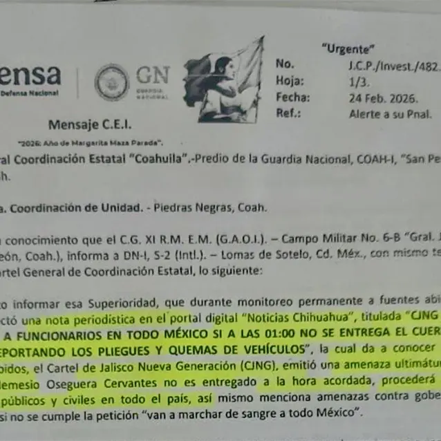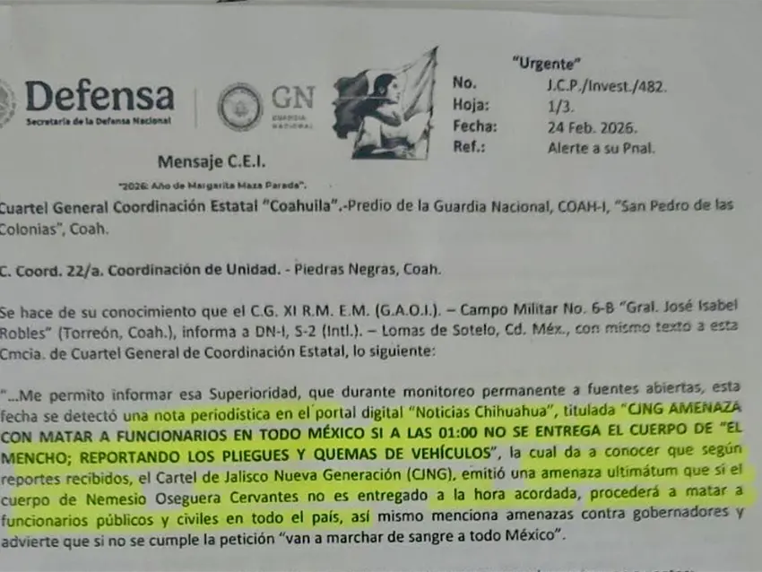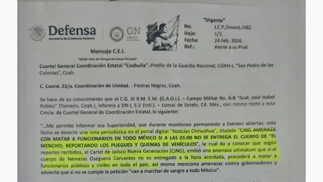 Dicho documento, fechado el 24 de febrero de 2026, es atribuido a la Secretaría de la Defensa Nacional y a la Guardia Nacional. En él se advierte sobre un monitoreo de "fuentes abiertas" donde se detectó una publicación titulada: "CJNG amenaza con matar a funcionarios en todo México si a las 01:00 no se entrega el cuerpo de ´El Mencho´".
