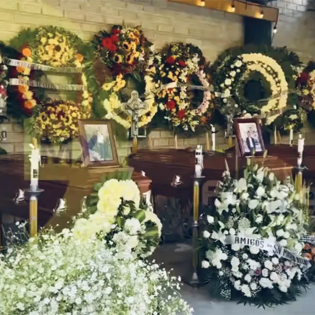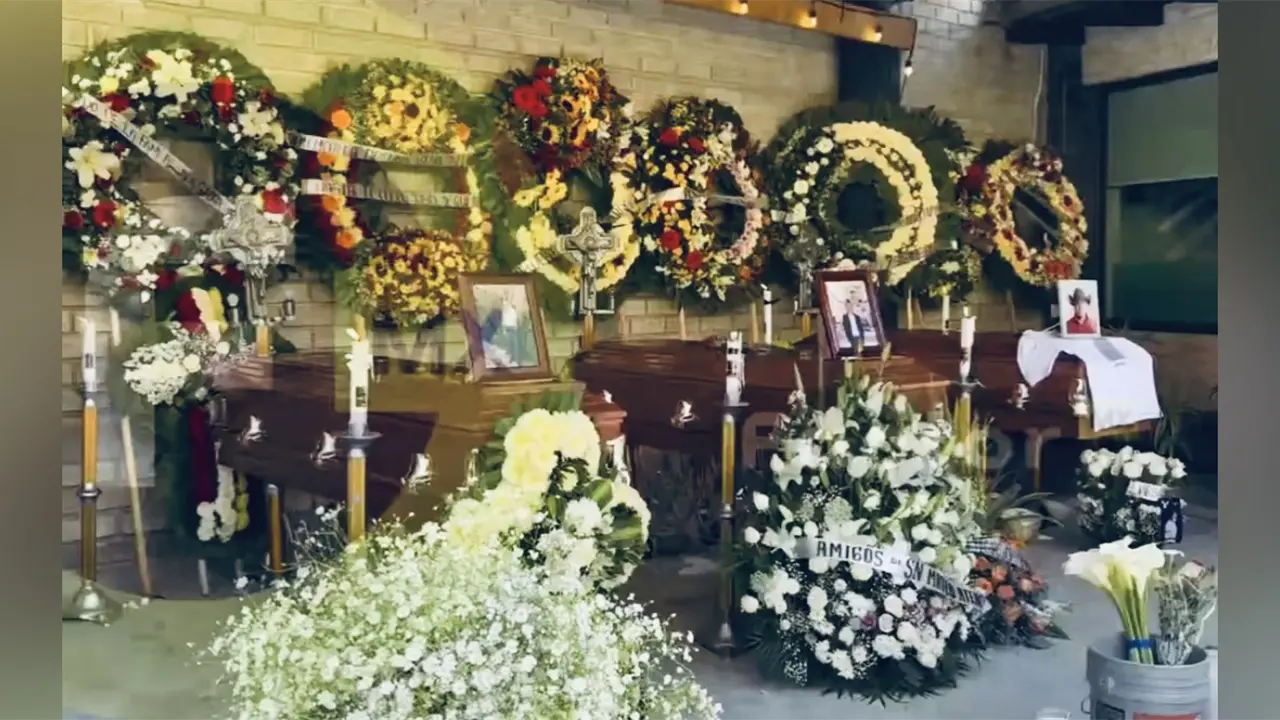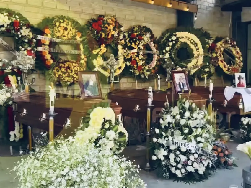 Los ataúdes fueron descendidos de la carroza fúnebre y colocados sobre pedestales adornados con flores, veladoras y fotografías. Antes, fueron bendecidos con agua y perfumados con incienso de copal, como parte de una ceremonia cargada de simbolismo.